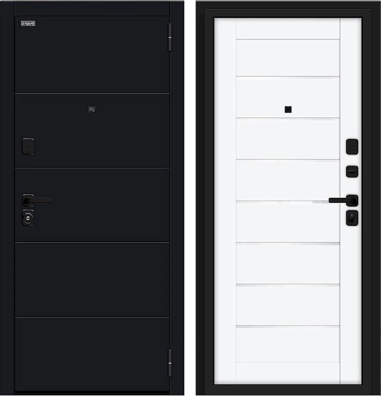 Надежная входная Дверь Браво Прайм/SBlack-Black Shell/White Silk премиум класса по цене 35 800 руб. Большая толщина стали защитит от проникновения в ваш дом, квартиру или коттедж. Используется очень качественная фурнитура: замки, цилиндры, ручки, защелки. Покрытие и отделка двери изготовлено под внимательным контролем производителя. Дверь имеет долгий срок службы и гарантию.